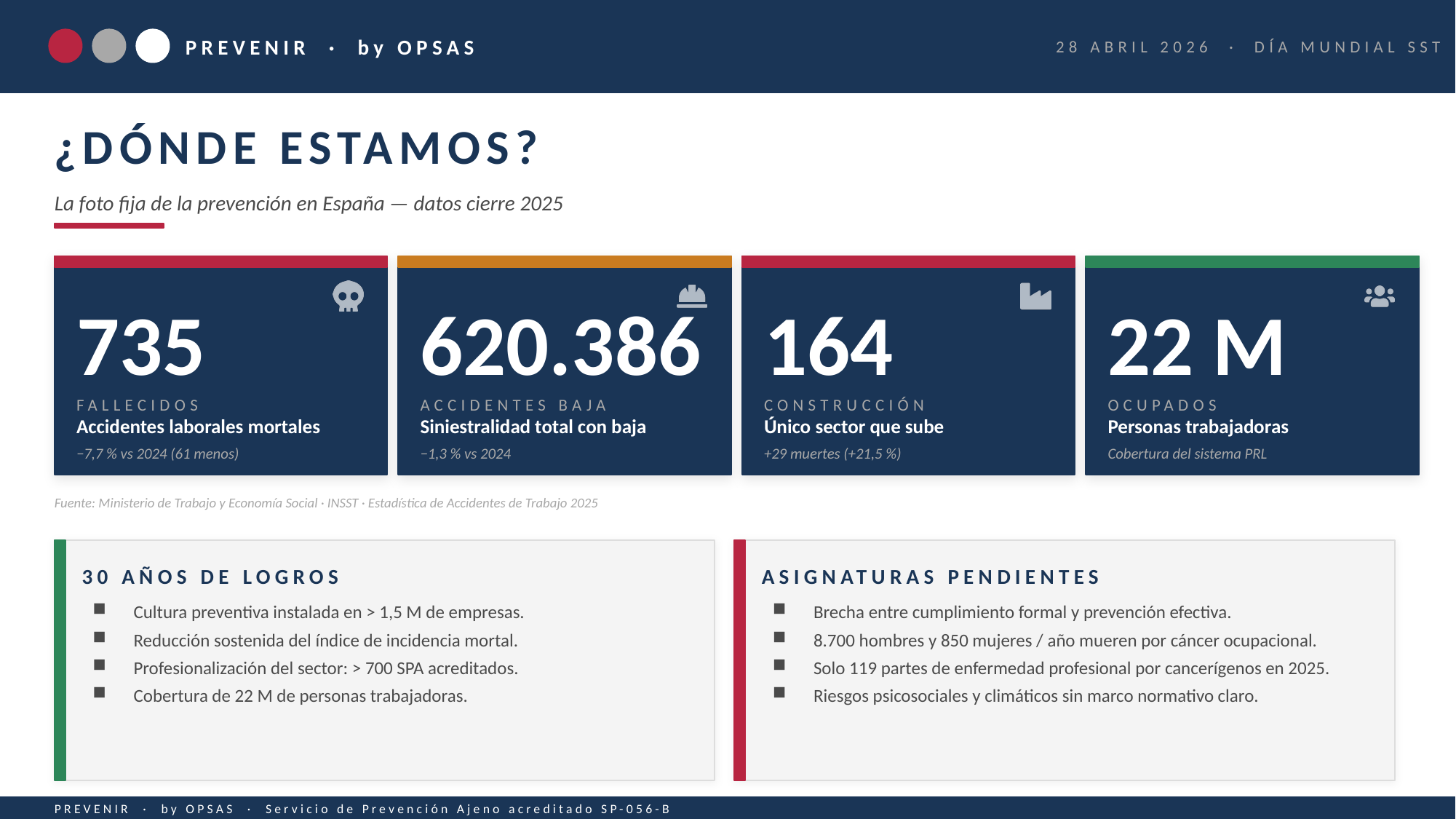 28 de abril, Día Internacional de la Seguridad y Salud en el Trabajo. Una efeméride que coincide, este 2026, con el momento normativo más relevante de las últimas tres décadas. Y con datos territoriales — sobre todo en Catalunya — que devuelven la conversación al sitio donde nunca debería haber salido: cada accidente mortal es un nombre, un puesto de trabajo, una familia.