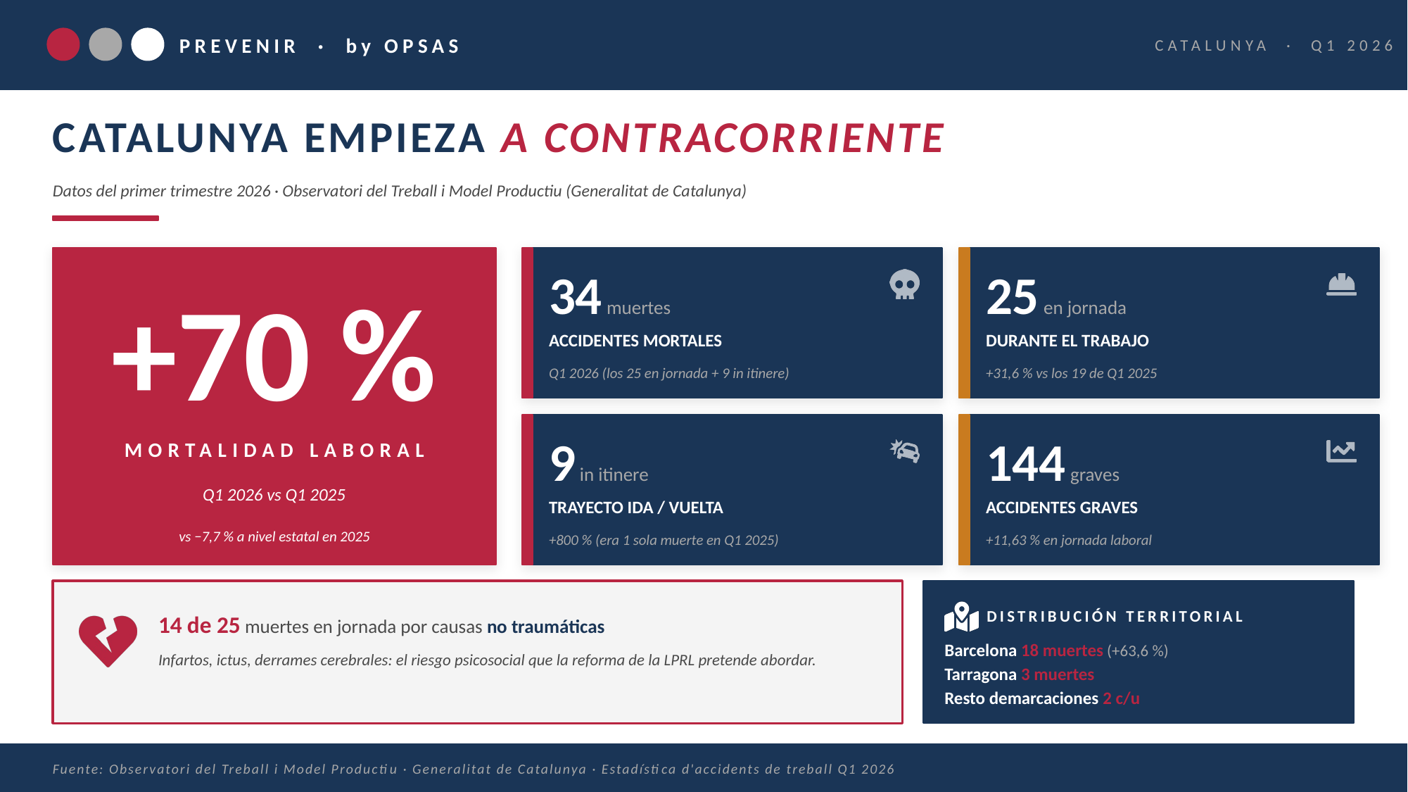 Para los servicios de prevención que operamos en Catalunya, el primer trimestre de 2026 no es una mera estadística: es una llamada de atención que exige reforzar la actividad preventiva, especialmente en ámbitos donde los riesgos psicosociales y cardiovasculares se cruzan con jornadas tensionadas y desplazamientos largos.