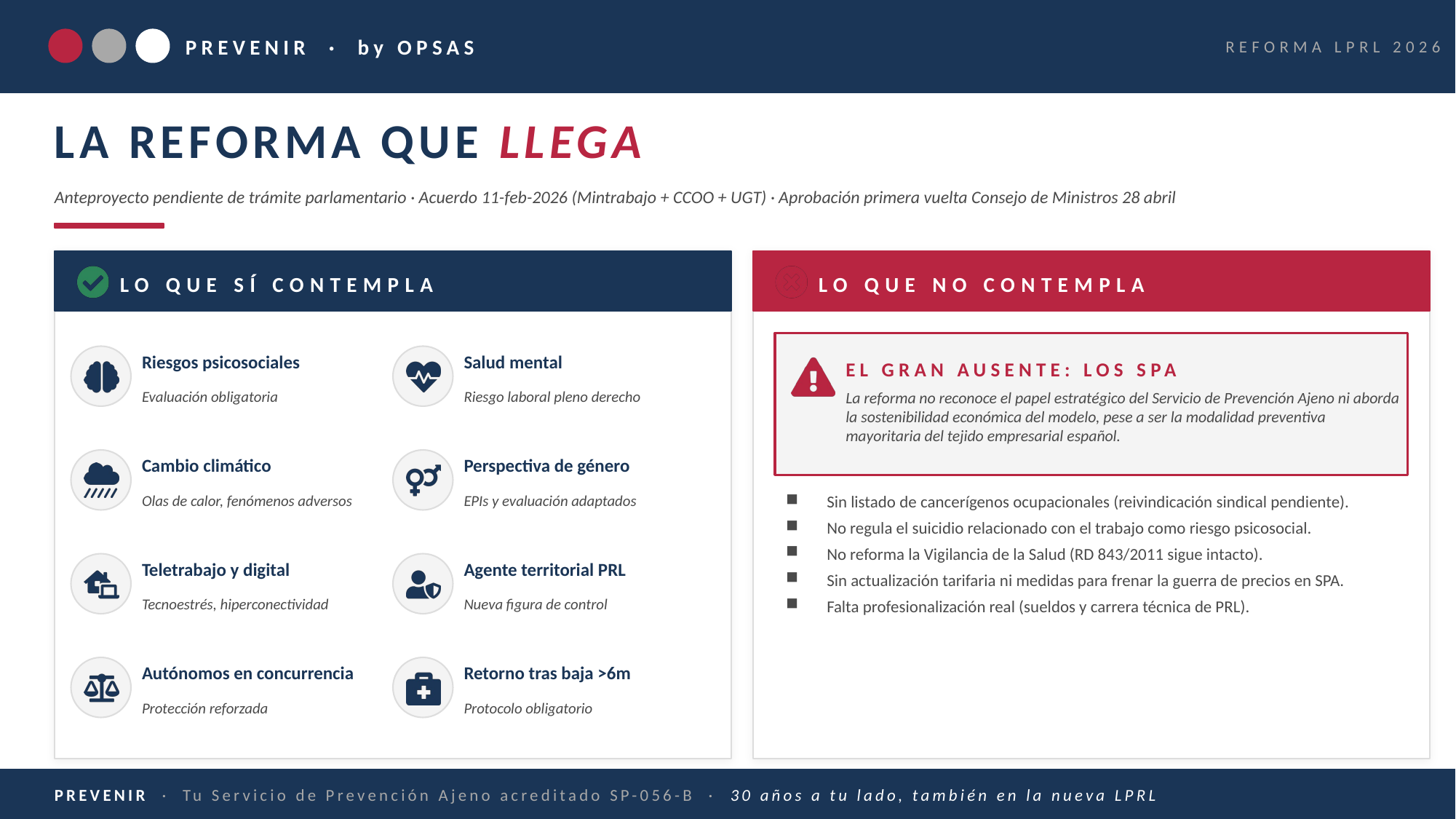 La reforma — con sus aciertos y sus huecos — abre una ventana de oportunidad para repensar la prevención en España. Pero la prevención no se hace en el BOE: se hace en los centros de trabajo. Y se hace, en la mayor parte del tejido productivo, a través del SPA.