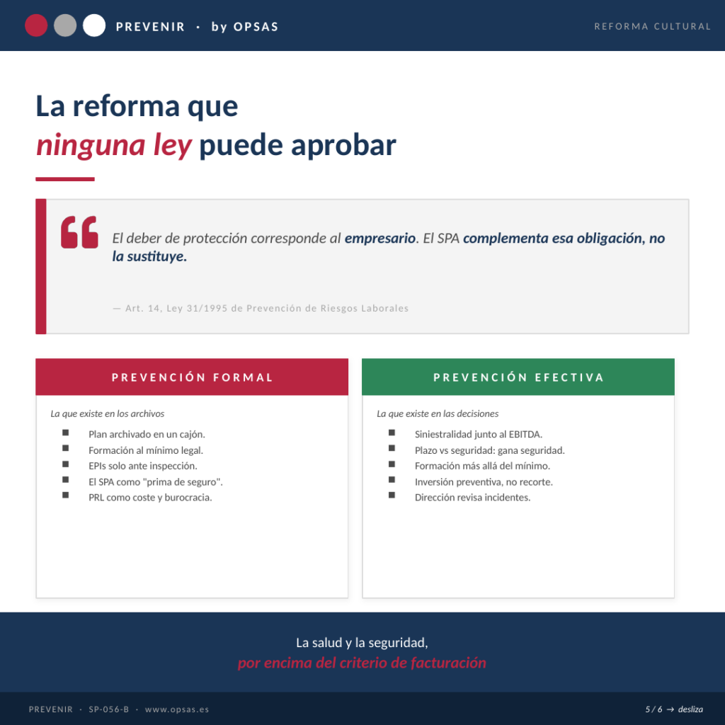 Mientras la PRL siga siendo en la cuenta de resultados una partida de coste — y no una inversión estratégica equiparable a la calidad o a la atención al cliente —, los grandes números del país pueden mejorar a base de tendencia y demografía, pero las grietas seguirán abiertas exactamente donde hoy están: en la construcción que aprieta plazos, en los servicios que estiran turnos, en las pymes que no tienen estructura interna y tratan al SPA como un proveedor más.