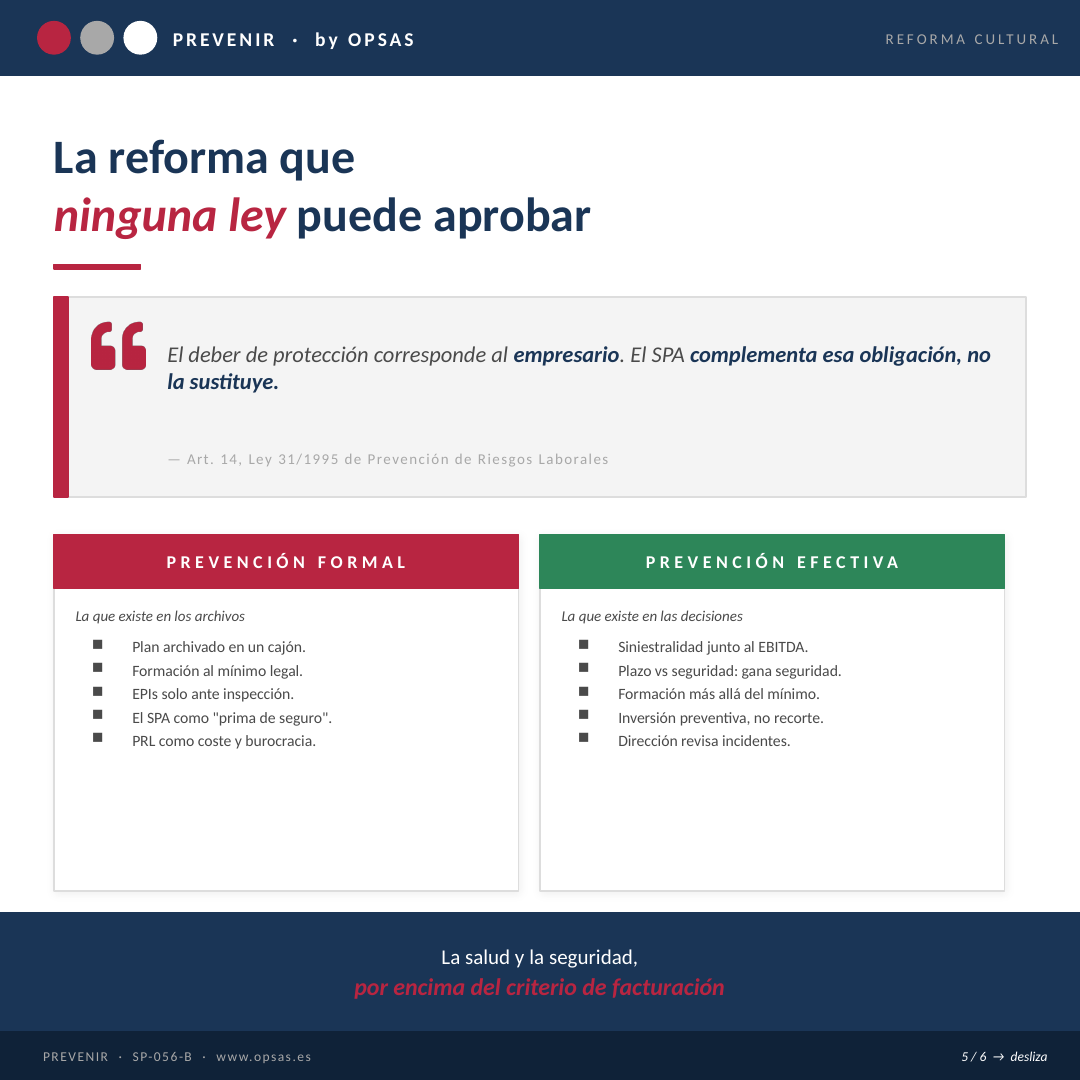Hasta aquí, el plano normativo. Pero conviene no engañarse: ninguna reforma legislativa, por ambiciosa que sea, reduce la siniestralidad si la empresa no la hace suya. Y «hacerla suya» no significa firmar un concierto con un SPA, archivar el plan de prevención y entregar los EPIs. Significa algo más exigente, más incómodo y más decisivo: que la propiedad, la dirección y los mandos de la empresa asuman que la seguridad y la salud de las personas trabajadoras es una prioridad por delante del criterio de facturación.