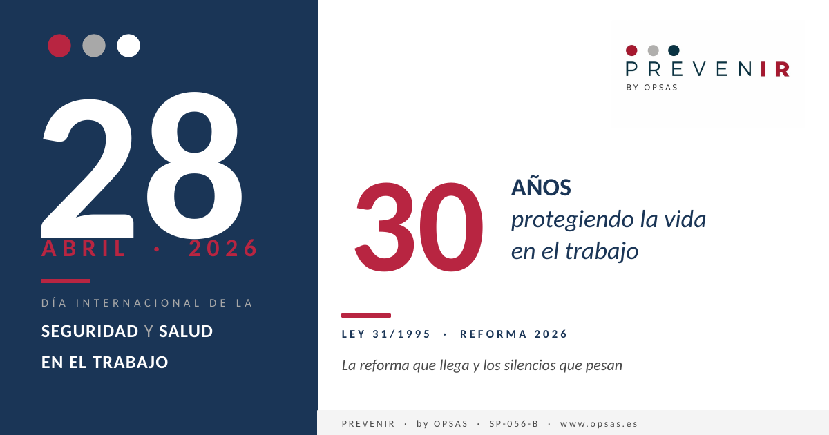 Cada 28 de abril, la Organización Internacional del Trabajo nos invita a recordar a quienes se dejan la salud — o la vida — en el trabajo. Este año, además, la fecha se solapa con un aniversario que merece ser nombrado: la Ley 31/1995, de 8 de noviembre, de Prevención de Riesgos Laborales cumple treinta años de vigencia. Y lo hace en pleno proceso de reforma estructural, que el Consejo de Ministros aprueba en primera vuelta precisamente esta semana.